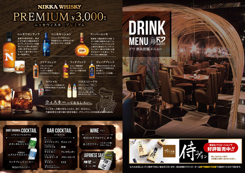 ニッカウイスキーをメインとした飲み放題プラン!