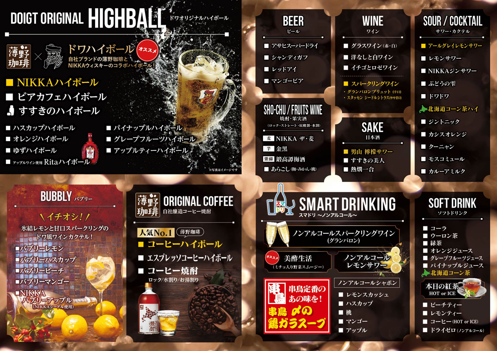 - スタンダード(2500円)…ドワオリジナル各種、ウイスキー各種、はこだてフルーツワイン、スパークリングワイン